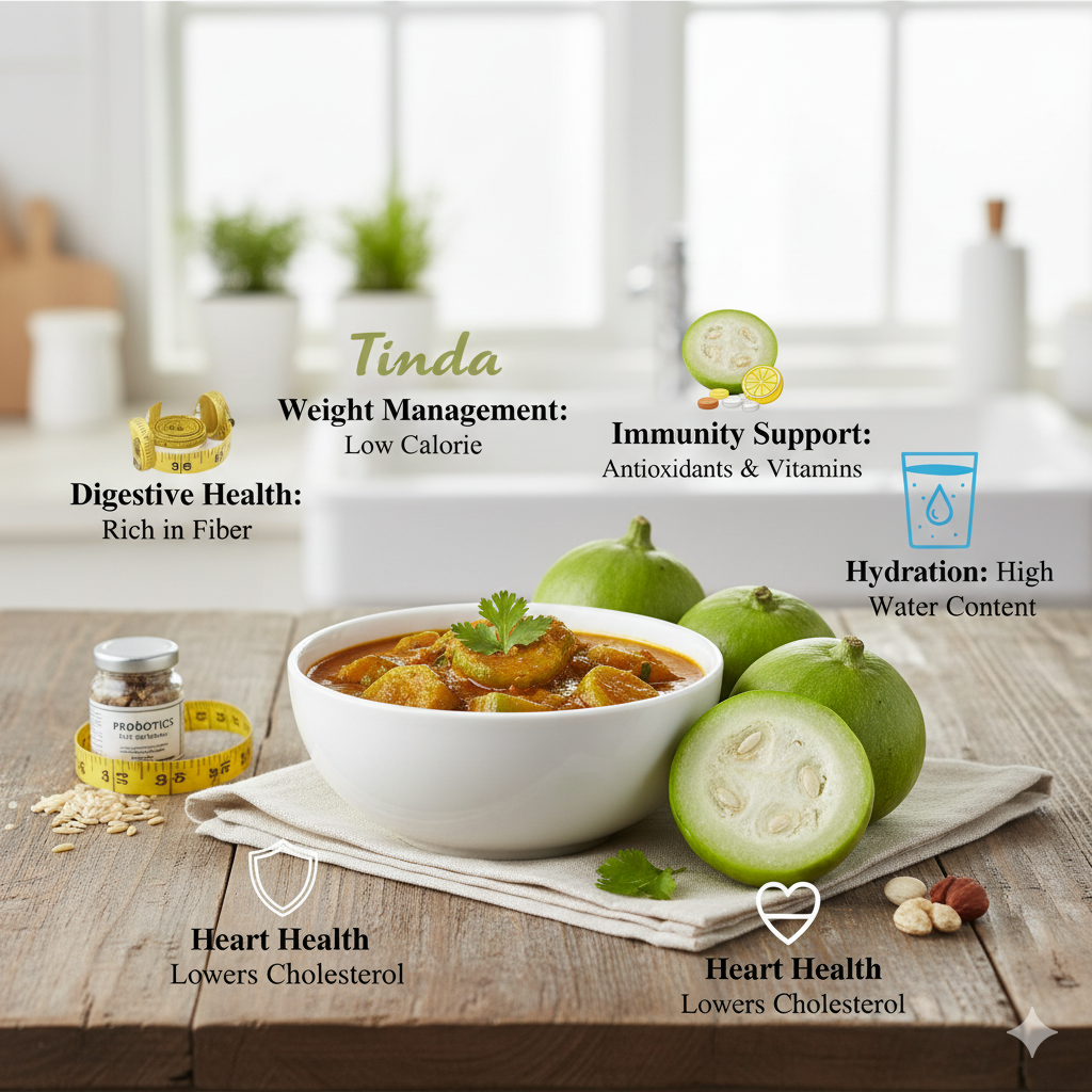 • Tinda (Indian Round Gourd): High in fiber, antioxidants, and water content; helps in digestion and nutrient absorption. While low in calories, it improves metabolic efficiency—a subtle but important support in a weight-gain regimen (tinda health benefits).