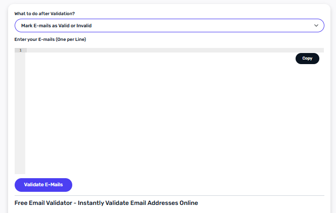 Click the validation button to start the process. The tool will check each email’s syntax, domain, and mail server.